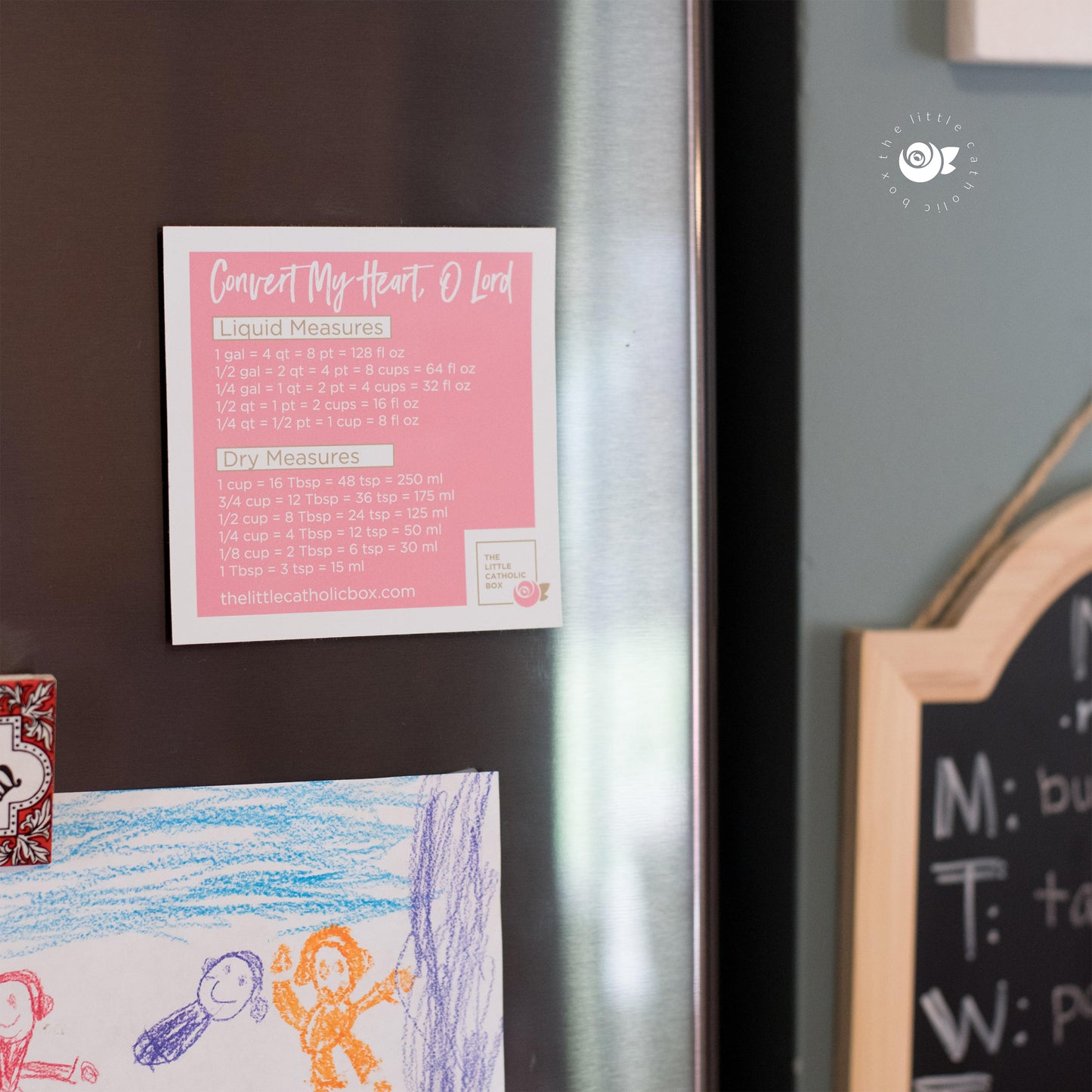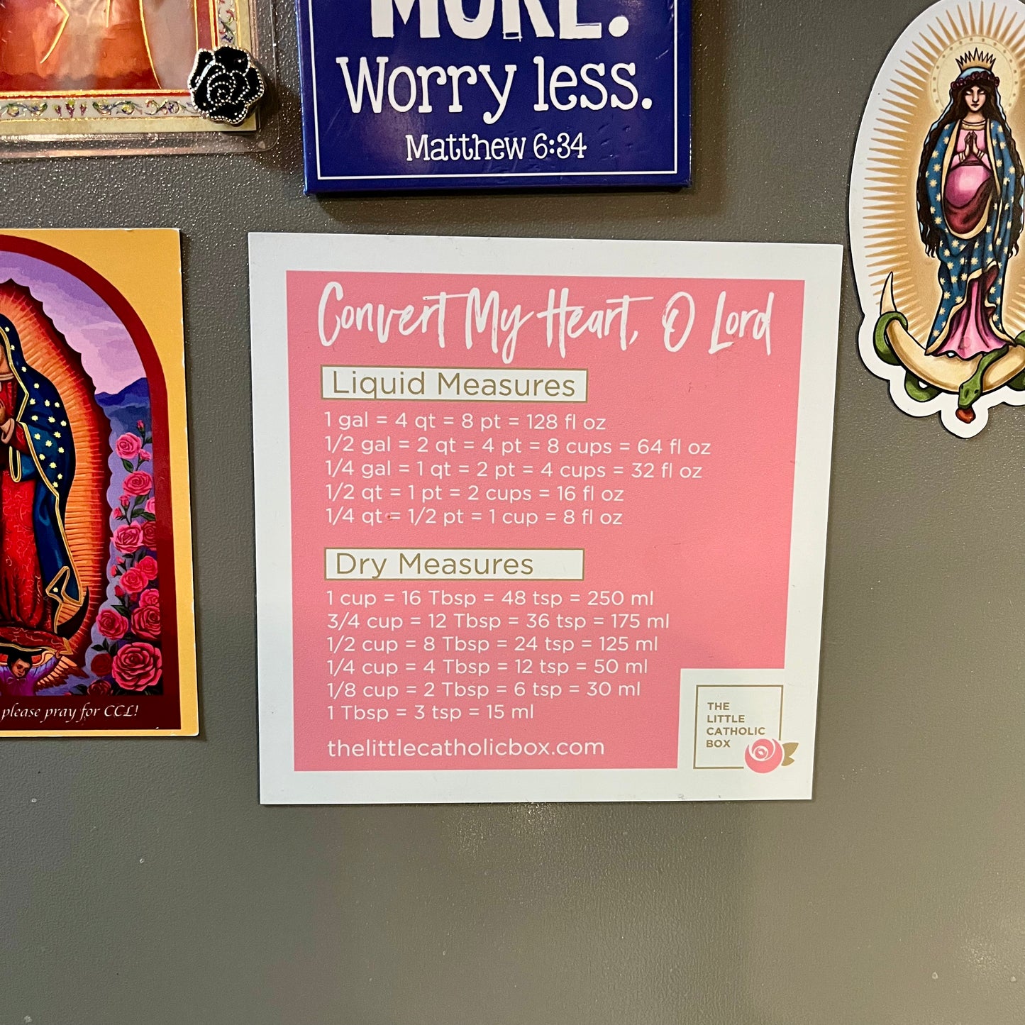 This is the prettiest magnet and looks so beautiful in our kitchen! My daughter and I love baking and cooking together and we reference this magnet often! I've gotten many compliments on it as well. It's a daily reminder for us to pray for God to "convert our hearts" as we convert measurements for kitchen ingredients. It's a wonderful price too and not expensive at all. We love it!