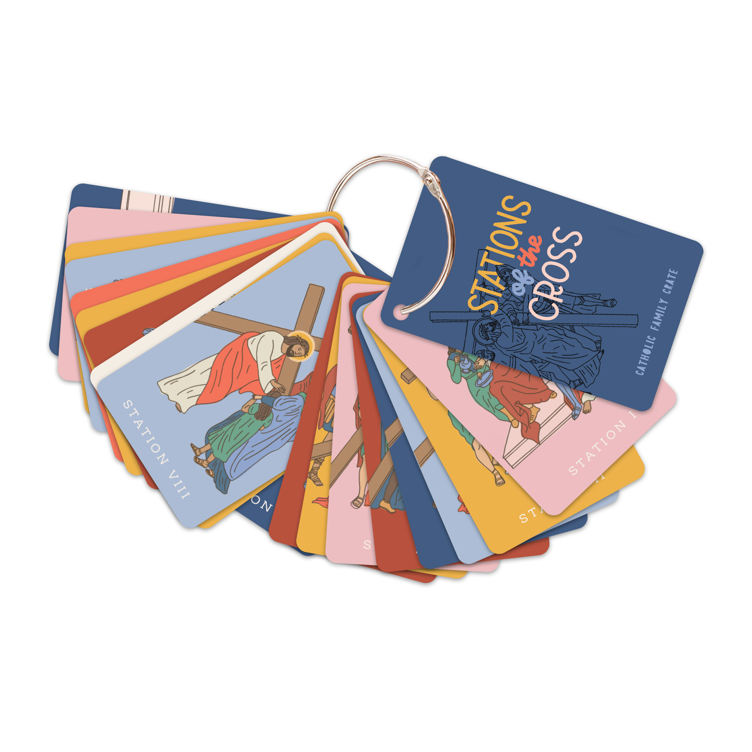 The Stations of the Cross Ring features a series of vibrant illustrations and accessible commentary for each station. The beautifully designed cards capture the essence of the Stations in a compact, easy-to-carry format. Each card includes prayers and reflections tailored to help children (and adults) connect with the journey of Christ's Passion in a meaningful way.